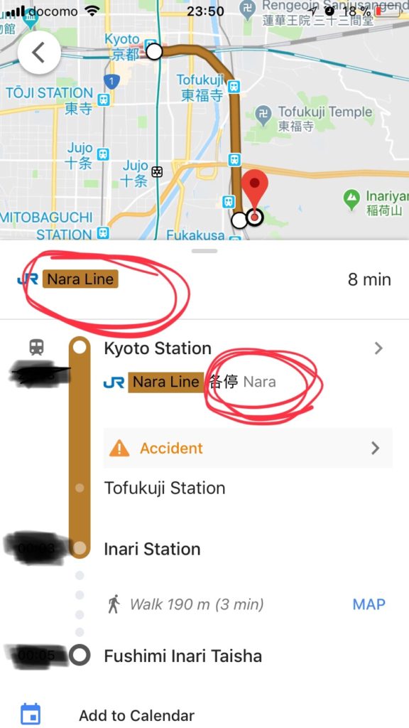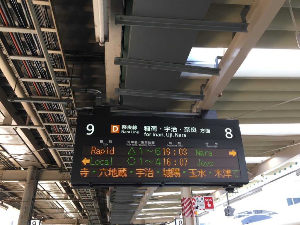 Per la linea Nara, sulle banchine, i cartelli indicano solo tre direzioni: Inari, Uji e Nara. Per facilitare la ricerca della piattaforma giusta, Google Maps consiglia di prendere il treno delle 16:07 in direzione di Nara.