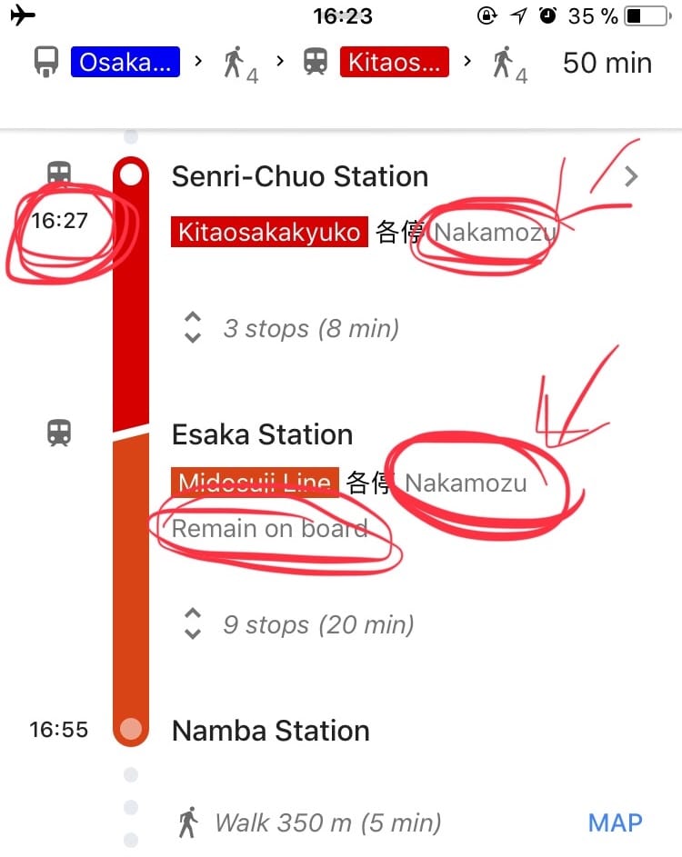 Quindi non fate affidamento solo sulla destinazione/terminazione del treno. Come nel caso precedente, prendi ESATTAMENTE il treno indicato su Google Maps – nell’esempio qui sotto, è il treno che parte alle 16:07, con capolinea Joyo. I treni giapponesi sono davvero puntuali, quindi fidatevi degli orari.