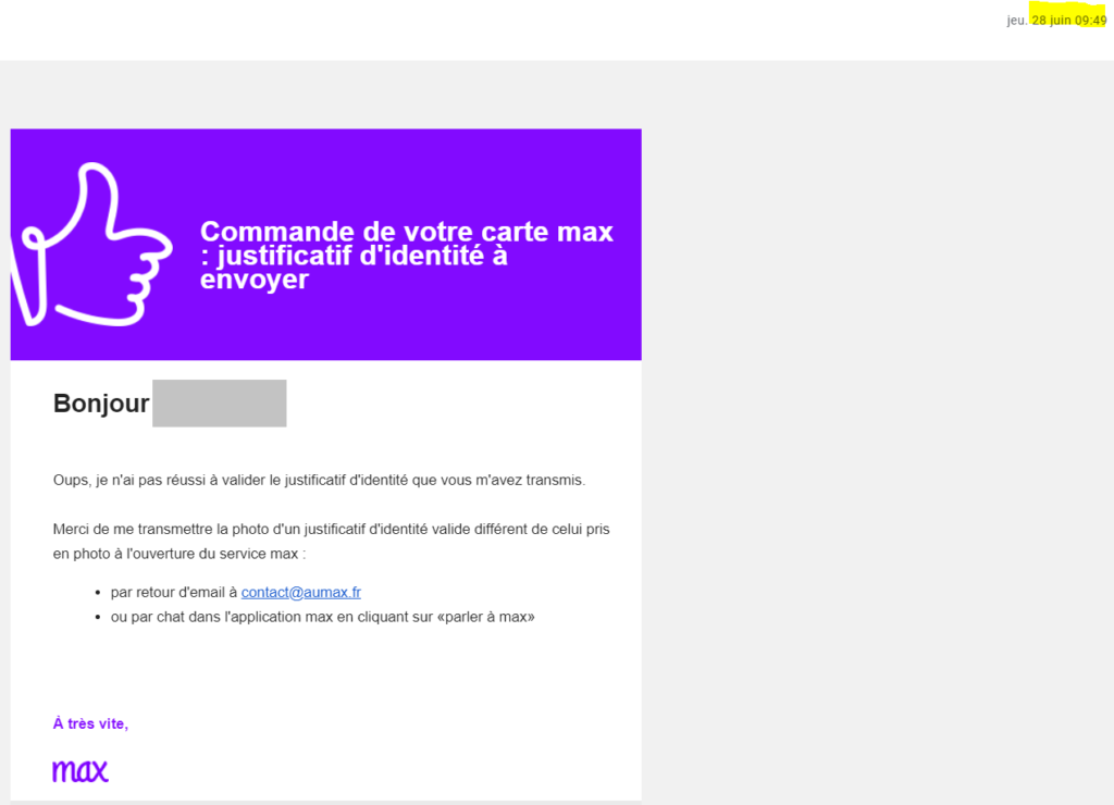 E ancora una volta succede una brutta sorpresa, ricevo un’e-mail il 28 giugno che mi dice che Max non è riuscito a convalidare il mio ID, devo mandarglielo di nuovo (valeva la pena chiedermi di passare attraverso la chat di supporto).